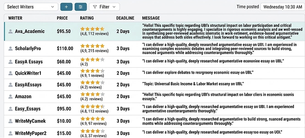 Most students look at star ratings. I look at how a writer phrases uncertainty. Anyone who opens with “I can definitely handle this, no problem” goes to the bottom of my list immediately – because UBI labor market literature is genuinely contested, and false confidence is a tell. What I’m looking for is something closer to: “I’d probably structure this around the substitution effect critique first – does that match what your professor is expecting?” That kind of message shows the person read the brief, understands the intellectual stakes, and is thinking about the argument rather than the transaction.