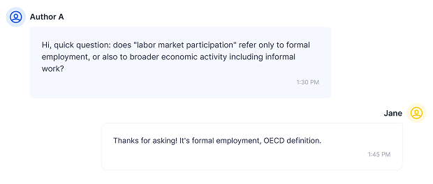 Author A blinked first. Asked whether “labor market participation” meant formal employment or broader economic activity including informal work. That’s exactly the kind of clarifying question that separates someone thinking about your essay from someone who just accepted a job. I confirmed: formal employment, OECD definition.