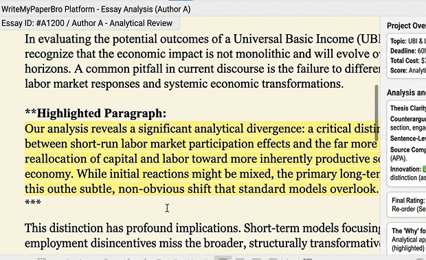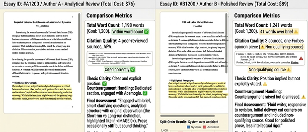 Author B’s paper read well at first. This is a genuine trap in essay evaluation – fluent prose creates the impression of depth. But fluency and rigor are not the same thing, and the counterargument section collapsed on close reading. “Some economists argue UBI could reduce work incentives, but evidence from pilot programs suggests otherwise” is not engaging a counterargument. It’s acknowledging one exists and moving on.